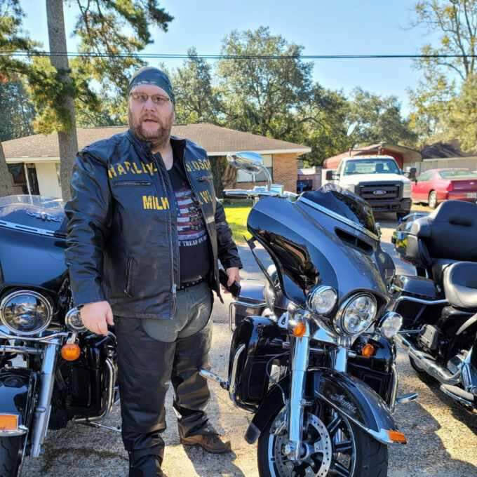 In November of 2020, Chris’s sister and her husband came by on their bikes and encouraged Chris to take one for a spin! Chris got on his sister’s bike and was hooked. He then took the Basic Rider Course and got riding lessons from his brother-in-law, a former Motorcycle Policeman. Chris bought a 2005 Yamaha V-Star and rode all over the area. Since then he’s had a series of V-twins and currently rides a 2016 H-D CVO.